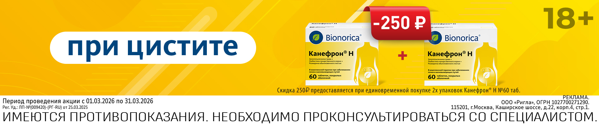 Акция проводится в период с 01.03.2026 по 31.03.2026. Организатор акции – ООО «Ригла», ИНН 7724211288. Акция действует на выделенный ассортимент. Акция действует в аптеках и в интернет-аптеке. Организатор акции вправе вносить изменения в условия акции в одностороннем порядке без предварительного уведомления. Организатор акции не гарантирует постоянное наличие полного акционного ассортимента в течение всего периода проведения акции. Наличие акционного товара в аптеках уточняйте у сотрудников аптек или по телефону 8-800-777-0303.